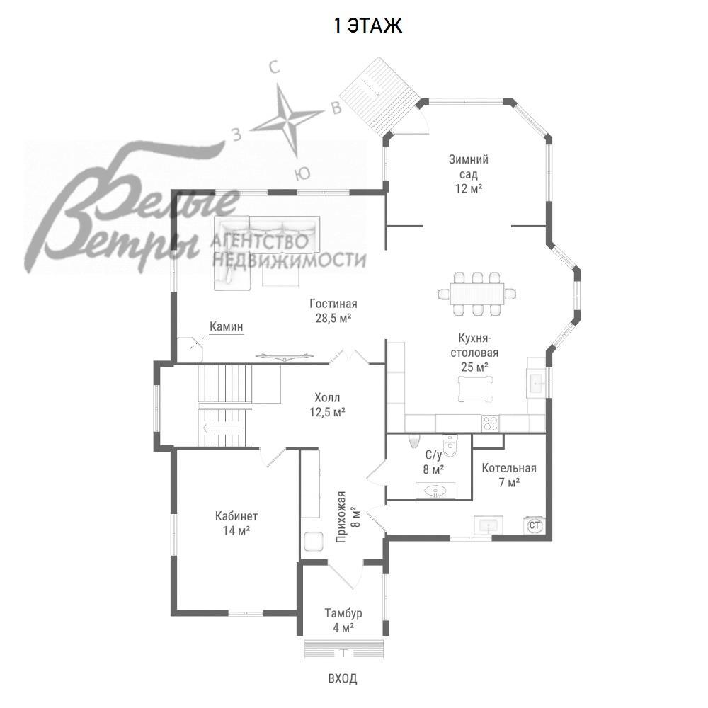 1-ый этаж: застеклённый тамбур 4 кв.м, прихожая 8 кв.м, холл 12,5 кв.м, гостиная 28,5 кв.м с действующим дровяным камином (NORDflam, отделан мрамором и клинкерной плиткой), кухня-столовая 25 кв.м с островом, зимний сад 12 кв.м с тренажерами, кабинет 14 кв.м, санузел 8 кв.м (с писсуаром), котельная 7 кв.м
