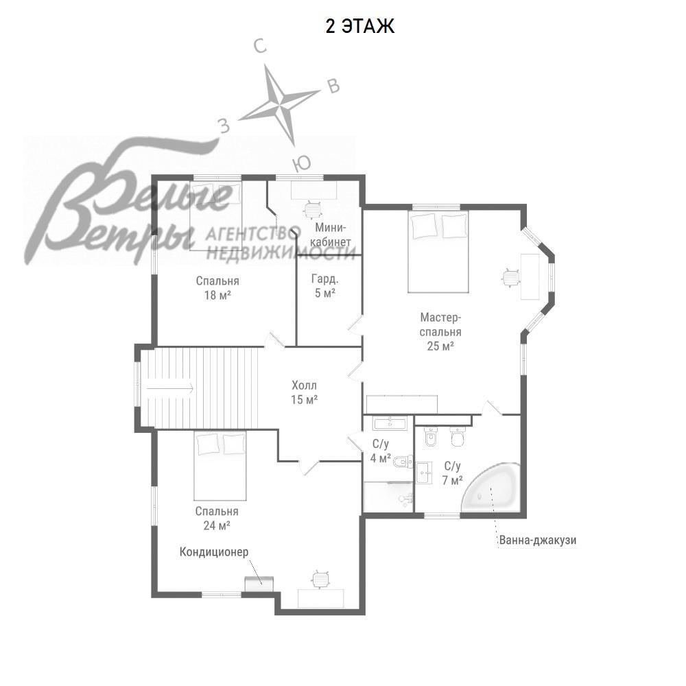 2-ой этаж: холл 15 кв.м, мастер-спальня 25 кв.м с своими гардеробной 5 кв.м и санузлом 7 кв.м (с двухместной ванной-джакузи), спальня 18 кв.м с мини-кабинетом-гардеробной, спальня 24 кв.м, общий санузел 4 кв.м (с душевой кабиной)